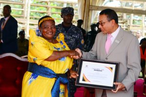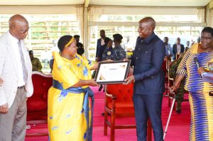 The Premier Rt. Hon. Nabbanja Robinah handing over a certificate of appreciation to the UNICEF representative during the PWDs commemorations at Mubende NTC