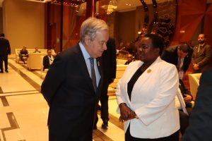 The Premier of Uganda Robinah Nabbanja talking to the United Nations General Secretary, Antonio Gutarez (left) after the meeting in Awaza City