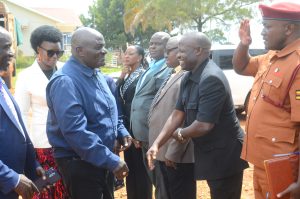 Gen. Katumba Wamala, the works and transport minister flanked by the state minister for Disaster preparedness, relief and Refugees and other officials while in Kalangala District