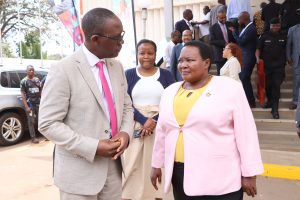 Prime Minister Robinah Nabbanja (right) talking to Dr. Daniel Kyabayinze (left), the Director Public Health at the Ministry of Health after the opening of the biosafety conference at Sheraton Hotel